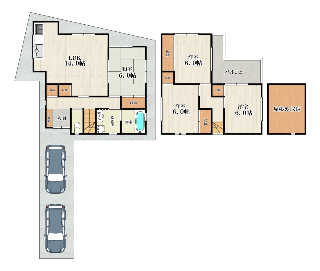 | 設備 | 駐車2台可 / 2沿線以上利用可 / システムキッチン / 陽当り良好 / 全居室収納 / 和室 / シャワー付洗面化粧台 / 浴室1坪以上 / 2階建 / 温水洗浄便座 / 床下収納 / 浴室に窓 / TVモニタ付インターホン / 通風良好 / 全居室6畳以上 / IHクッキングヒーター / シューズインクローク / 屋根裏収納 / 食器洗乾燥機 / オール電化 |